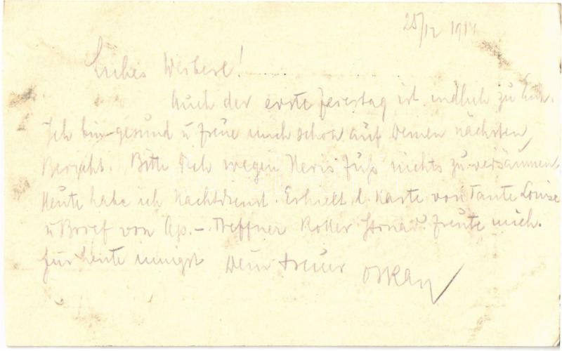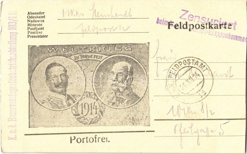 1914 Weltkrieg. In Treue Fest / Első világháborús tábori posta II. Vilmos és Ferenc József arcképével / WWI Austro-Hungarian K.u.K. military, field post postcard with Wilhelm II and Franz Joseph, Viribus Unitis propaganda + "K.u.K. Reservetelegrafenbetriebsabteilung 103/1B" "Zensuriert beim K.u.K. I. Armee-Etappenkommando" (vágott / cut)