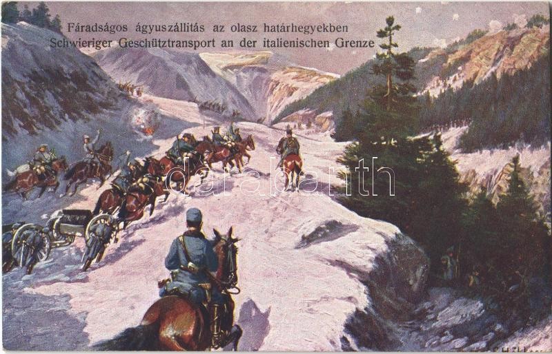 Beschreibung: Fáradságos ágyúszállítás az olasz határhegyekben / WWI K.u.K. (Austro-Hungarian) military art postcard s: F. Höllerer