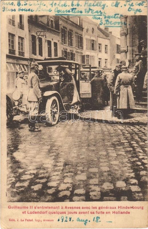 Guillaume II s'entretenant a Avesnes avec les généraux Hindenbourg et Ludendorf quelques jours avant sa fuite en Hollande / Avesnes, Wilhelm II with General Hindenburg and Ludendorf, automobile (Rb)