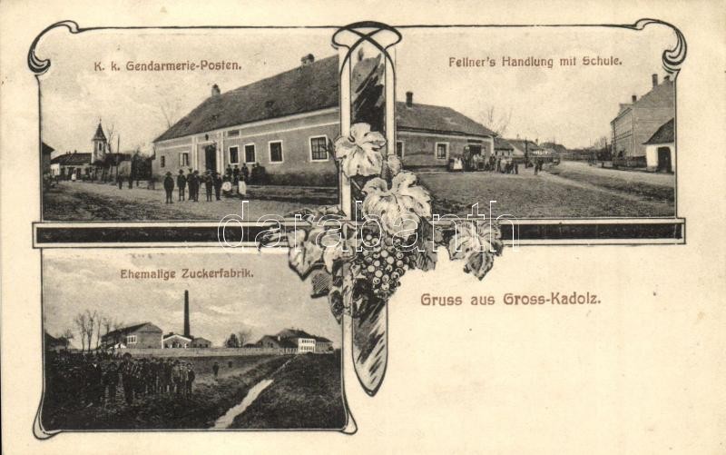 Seefeld-Kadolz, Gross Kadolz; K. k. Gendarmerie-Posten, Fellner's Handlung mit Schule, Ehemalige Zuckerfabrik / Gendarmery, post office, shop, school, sugar factory, floral Art Nouveau, Jos. Fellner (EK)