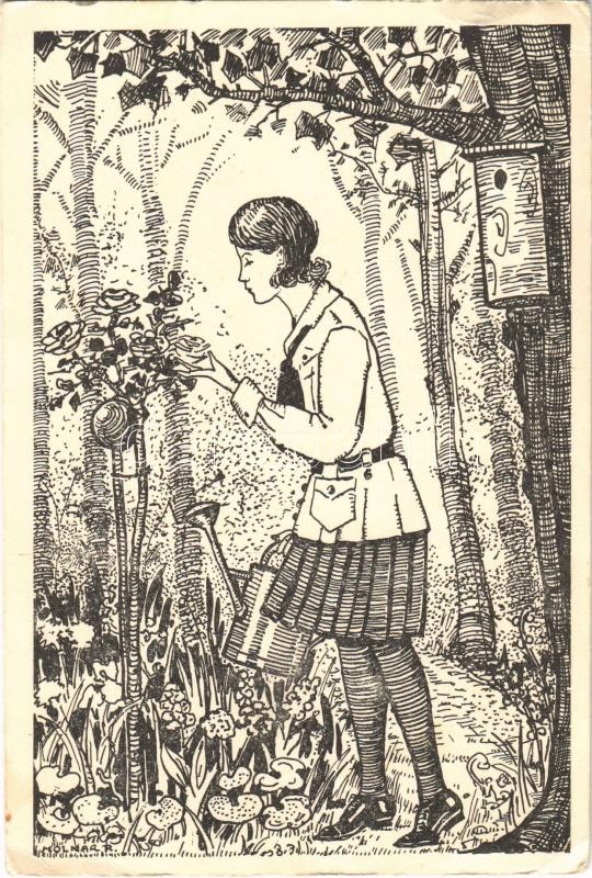 1938 A cserkészlány szereti a természetet, jó az állatokhoz, kíméli a növényeket. Magyar Cserkészleány Szövetség kiadása / A Girl Scout is a friend of Nature. Hungarian girl scout art postcard s: Molnár R. (EK)