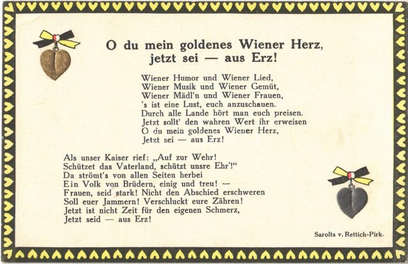 Beschreibung: O du mein goldenes Wiener Herz, jetzt sei aus Erz! / WWI Austro-Hungarian K.u.K. military propaganda, Emb. hearts. Sarolta v. Rettich-Pirk (EK)