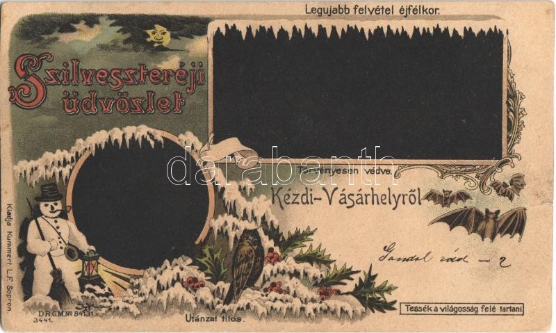 1899 Kézdivásárhely, Targu Secuiesc; Szilveszteréji üdvözlet! Legújabb felvétel éjfélkor. Tessék a világosság felé tartani! Szecessziós üdvözlőlap denevérrel, bagollyal és hóemberrel / New Year greeting art postcard, bat, owl, snowman. Art Nouveau, Hold to light litho (szakadás / tear)