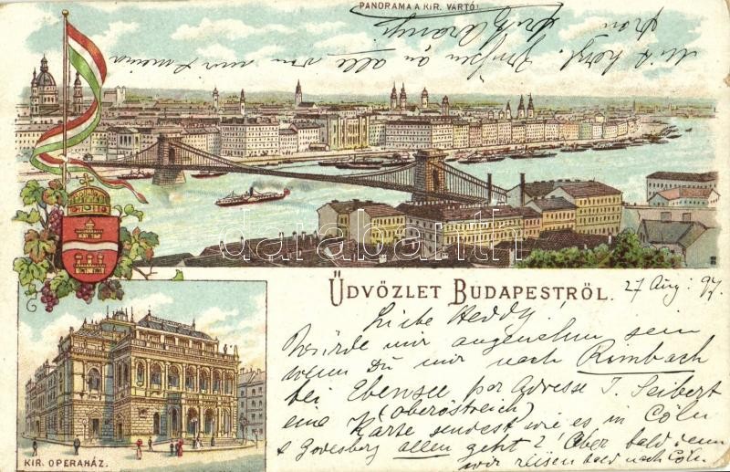 1897 (Vorläufer!!) Budapest, Panoráma a Királyi vártól, Kir. Opera, Lánchíd, magyar zászló és Budapest címere. Art Nouveau, floral, litho (vágott / cut)