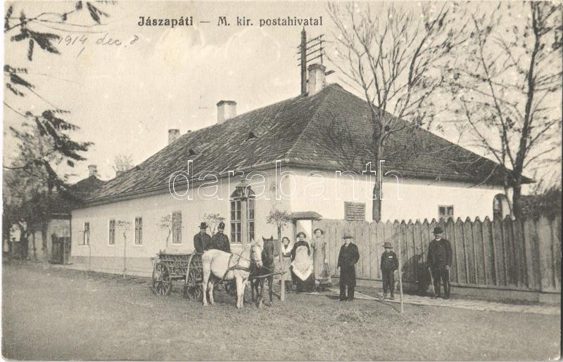 1914 Jászapáti, M. kir. postahivatal, lovaskocsi. Koczka Andor kiadása https://www.darabanth.com/de/361-Fernauktion/361.0/Ansichtskarten/Ungarn~1500006/1914-Jaszapati-M-kir-postahivatal-lovaskocsi-Koczka-Andor-kiadasa~II2082682