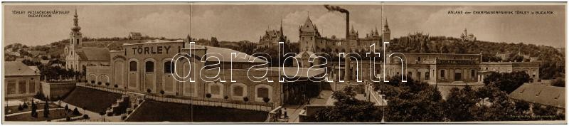 Budapest XXII. Budafok, Törley pezsgőborgyár, gyártelep és kastély. Tervezte Ray Rezső műépítész. 3-részes kihajtható panorámalap / Törley champagne factory. 3-tiled foldable panoramacard (hajtásnál kicsit szakadt / slightly torn at the fold)