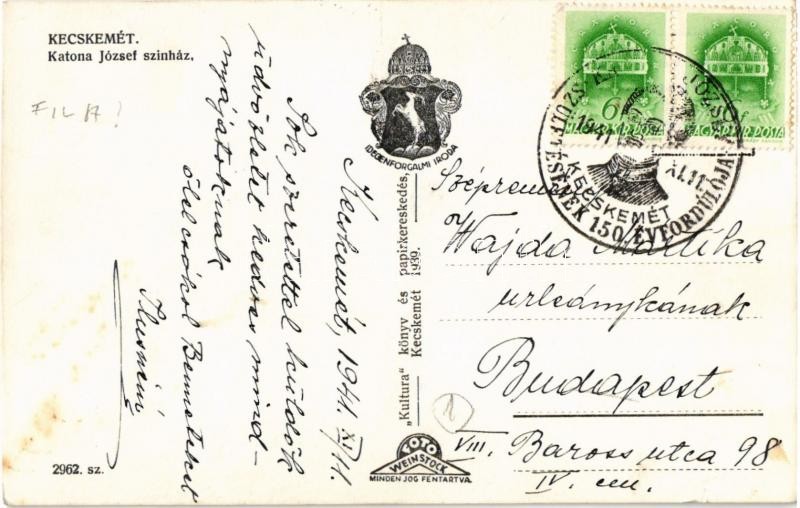 Beschreibung: Kecskemét, Katona József színház, Szentháromság szobor, rendőr + 1791-1941 Katona József születésének 150. évfordulója Kecskemét So. Stpl.
