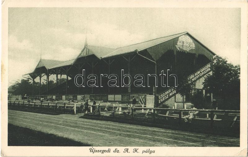 Szeged, Újszeged; SZAK (Szegedi Atlétikai Klub) sportpálya, irredenta felirat és Nagymagyarország térkép a lelátó oldalán: "Csonka Magyarország nem ország, egész Magyarország mennyország" (EK)