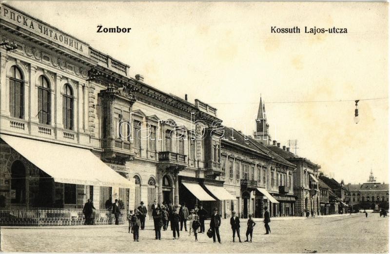 1908 Zombor, Sombor; Kossuth Lajos utca, Knipl Gáspár sörcsarnoka, Bank és Bizományi üzlete, Schlieszer testvérek üzlete / street view with beer hall, shops and bank