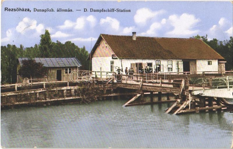 1916 Rezsőháza, Rudolfsgnad, Knicanin; Duna-Gőzhajózási Társaság hajóállomása. Kiadja Varga János. Oldal felvétele / D. Dampfschiff-Station / Danube steamship station