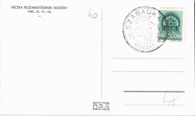 Beschreibung: 1941 Szabadka, Subotica; bevonulás. Bácska felszabadításának emlékére / entry of the Hungarian troops + "1941 Szabadka visszatért" So. Stpl