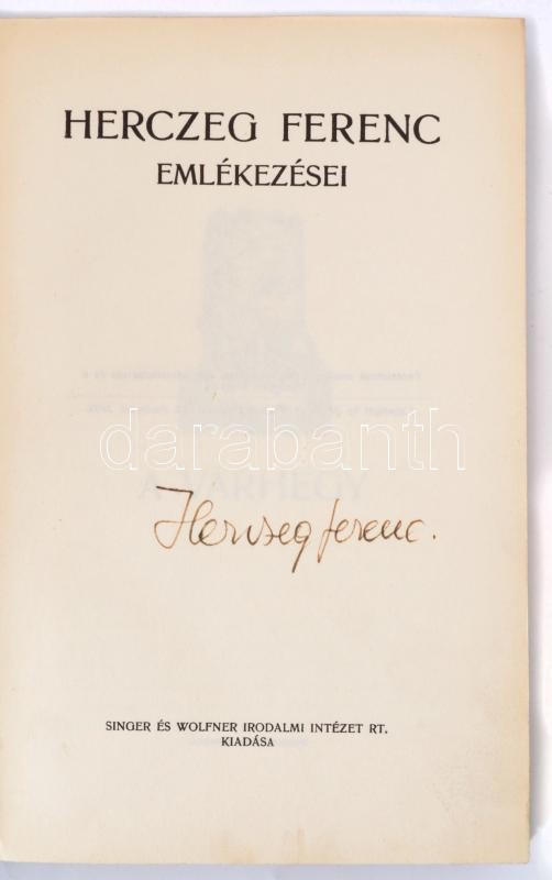 Herczeg Ferenc emlékezései. Aláírt példány! . Bp., én. Singer. Kiadó e... https://www.darabanth.com/de/361-Fernauktion/361.0/Bucher/Bucher-Andere-kuriositaten~1000020/Herczeg-Ferenc-emlekezesei-Alairt-peldany-Bp-en-Singer-Kiado-egeszvaszon-kotesbe~II2080048