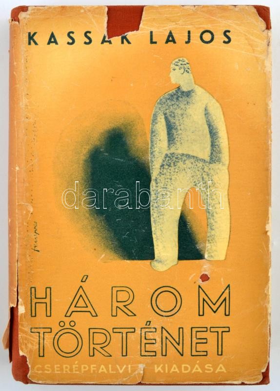 Kassák Lajos: Három történet. A borítékrajz Fenyves Sándor munkája. Bp.,(1935), Cserépfalvi, 308+4 p. Első kiadás. Kiadói egészvászon-kötés, kiadói szakadozott, kissé hiányos papír védőborítóban, a címlapon "árleszállítás" bélyegzéssel.