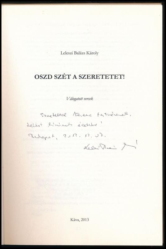Leleszi Balázs Károly: Oszd szét a szeretetet! Válogatott versek. Káva... https://www.darabanth.com/de/361-Fernauktion/361.0/Bucher/Bucher-Andere-kuriositaten~1000020/Leleszi-Balazs-Karoly-Oszd-szet-a-szeretetet-Valogatott-versek-Kava-2013-Oainvest-ny-Ki~II2054945
