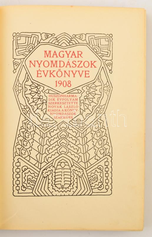 Magyar nyomdászok évkönyve 1908. Kiadja a Könyvnyomdászok Szakköre. Szerkeszti Novák László. Bp., (19078.) Világosság nyomda. Gazdagon illusztrált, részben színes képekkel. Aranyozott, szecessziós kiadói vászonkötésben. Jó állapotban