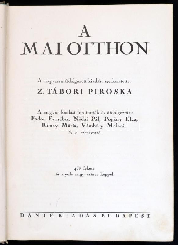 A mai otthon. Összeállította: Maria Mathilde Mandl. Szerk.: Z. Tábori Piroska. Bp.,én.[1928],Dante,392+159 p. + 8 t. (Színes képtáblák.) Fekete-fehér szövegközti és egészoldalas képekkel. Kiadói aranyozott, festett egészvászon-kötés, kopott borítóval.