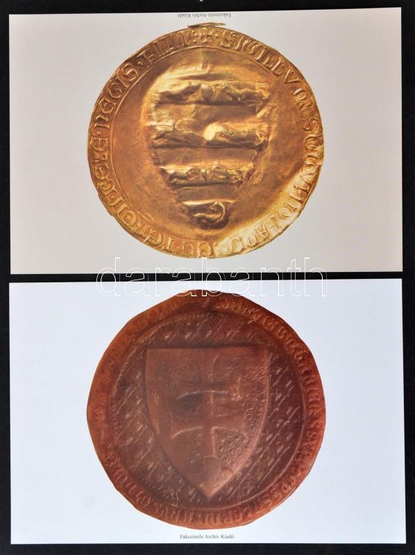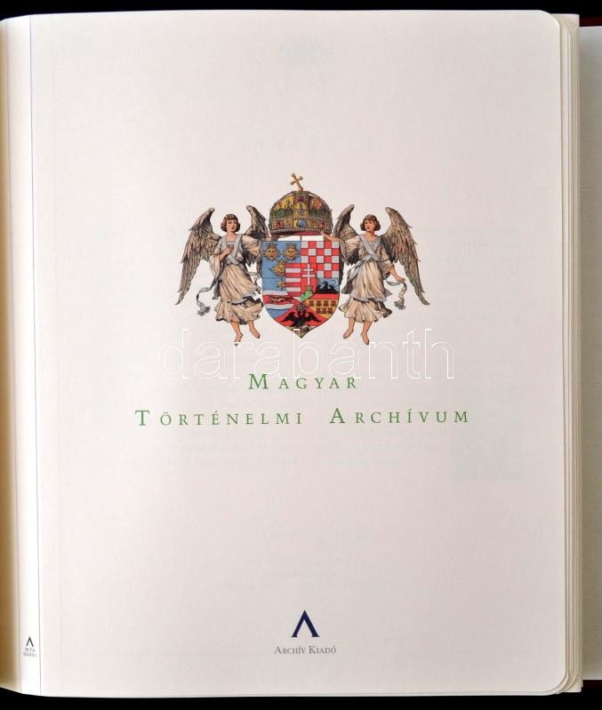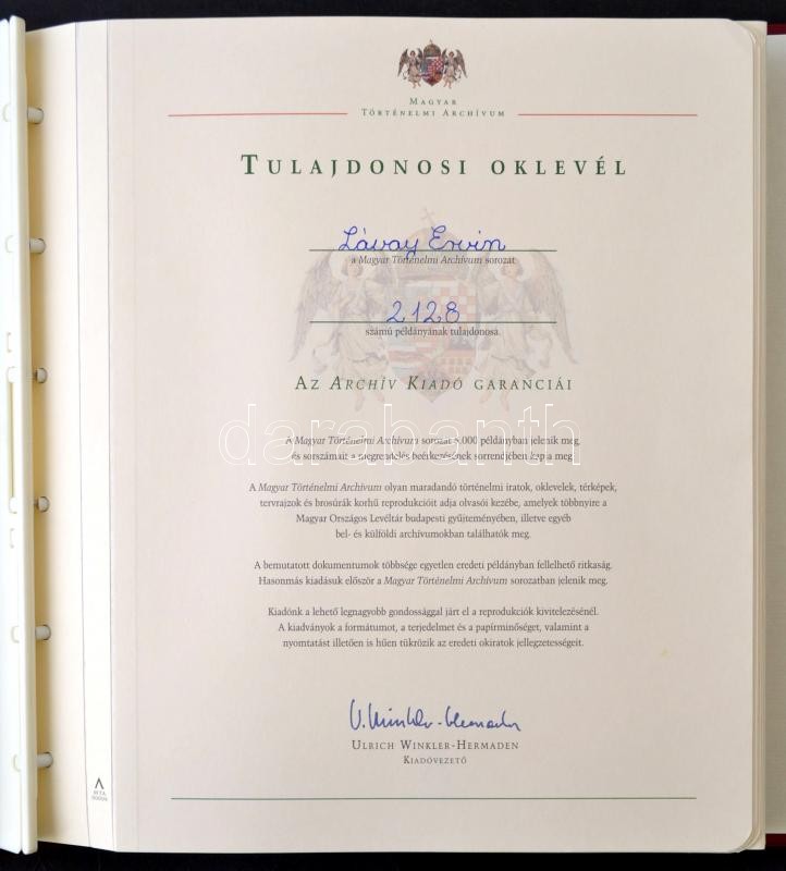 Magyar Történelmi ArchÃvum sorozat, 9 db. Kiadói aranyozott műbÅ‘r-mappában, kiadói tokban, a mappákban 87 db témát tartalmazó mappával. Reprodukciókkal, mellékletekkel, a dokumentumok átirataival, fordÃtásaival. SzÃnes illusztrációkkal. Bp., ArchÃv Kiadó. Az elsÅ‘ kötetben tulajdonosi oklevéllel. 2128. számú sorszámozott példány. A teljes gyűjteményt igazoló kiadói levéllel. Jó állapotban.