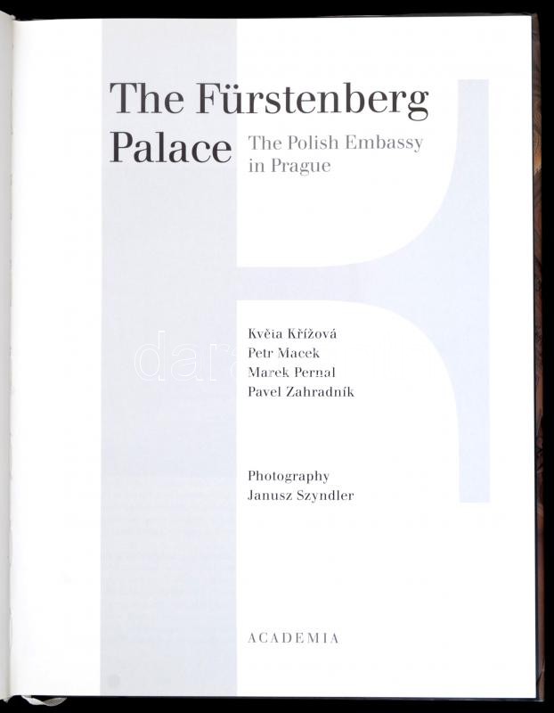 Kveta Krízová-Petr Macek-Marek Pernal-Pavel Zahradník: The Fürstenberg Palace. The Polish Embassy in Prague. Prague, 2000, Academia. Janusz Szyndler fotóival. Angol nyelven. Kiadói egészvászon-kötés, kiadói papír védőborítóban.