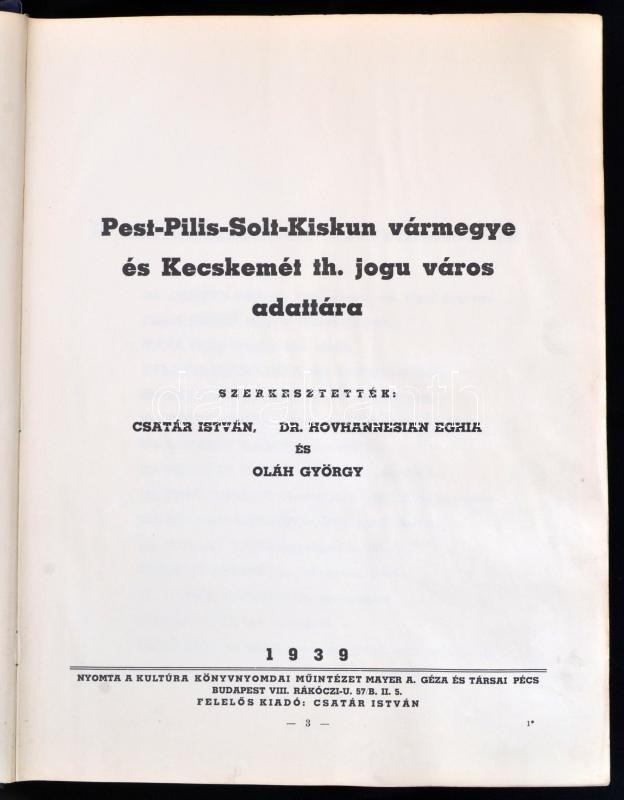 Pest-Pilis-Solt-Kiskun vármegye és Kecskemét th. jogú város adattára. Szerkesztették: Csatár István, Hovhannesian Eghia és Oláh György. (Előszó: vitéz dr. Endre László alispán.) Budapest, 1939. Kultúra Könyvnyomdai Műintézet. Kiadói, laza egészvászon kötés, első néhány lap foltos.