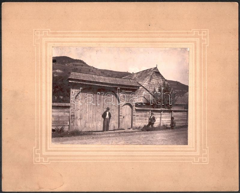 Beschreibung: cca 1890 Mezőtelegd (Erdély), Gábori Lajos portája faragott székelykapuval, kartonra kasírozott fotó, 12,5×17 cm