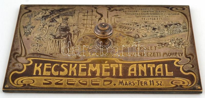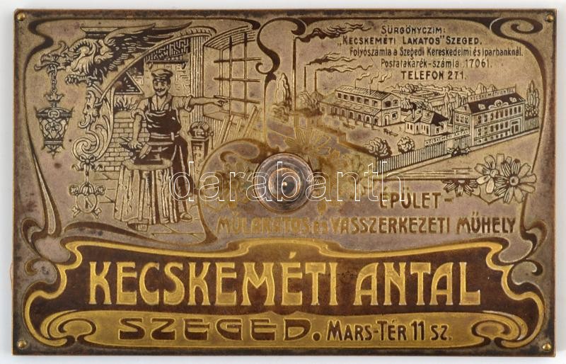 Beschreibung: cca 1900 Szeged, Kecskeméti Lajos műlakatos szecessziós reklámos réz nyomtató lap, tapper 12x8 cm