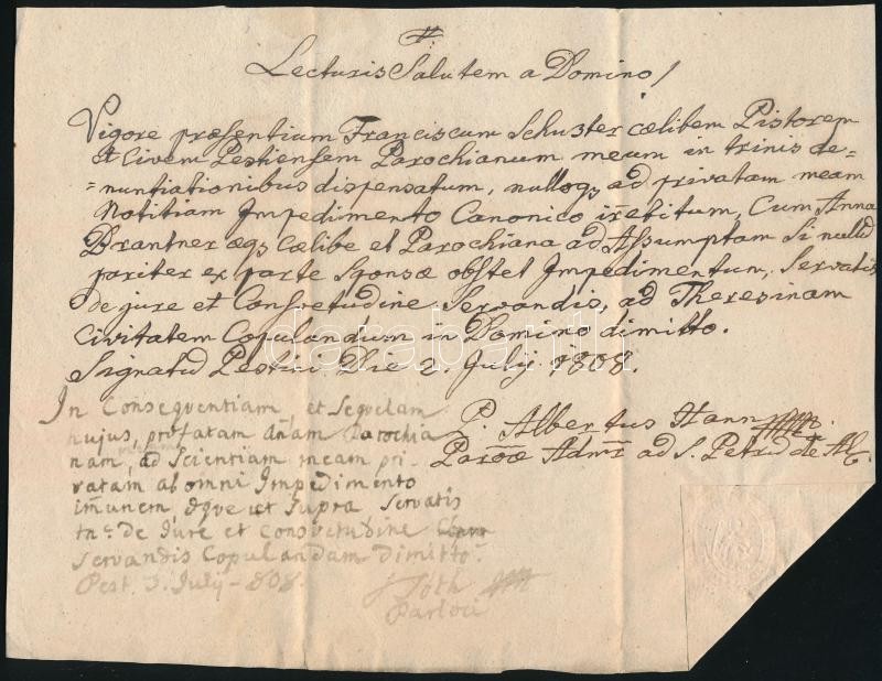 Beschreibung: 1808 Pest, latin nyelvű irat szárazpecséttel
