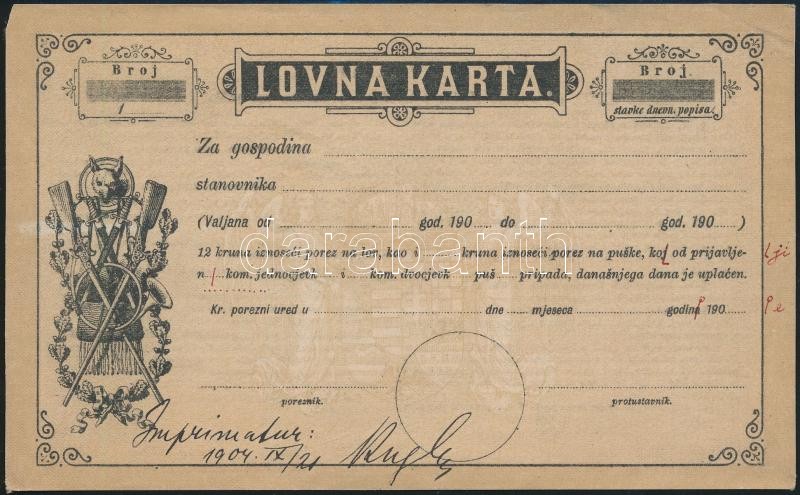 1904 Horvát nyelvű kitöltetlen vadászjegy nyomdai minta / Croatian Hun... https://www.darabanth.com/de/361-Fernauktion/361.0/Kunst-Dokumente-andere-Sammelgebiete/Dokument~500020/1904-Horvat-nyelvu-kitoltetlen-vadaszjegy-nyomdai-minta-Croatian-Hunting-ID~II2085175