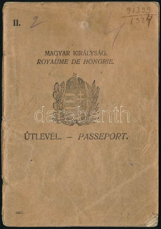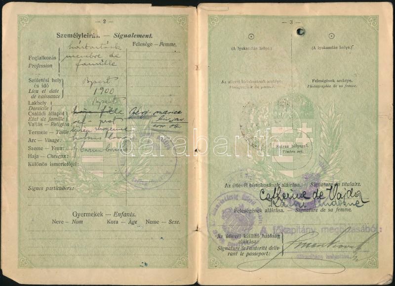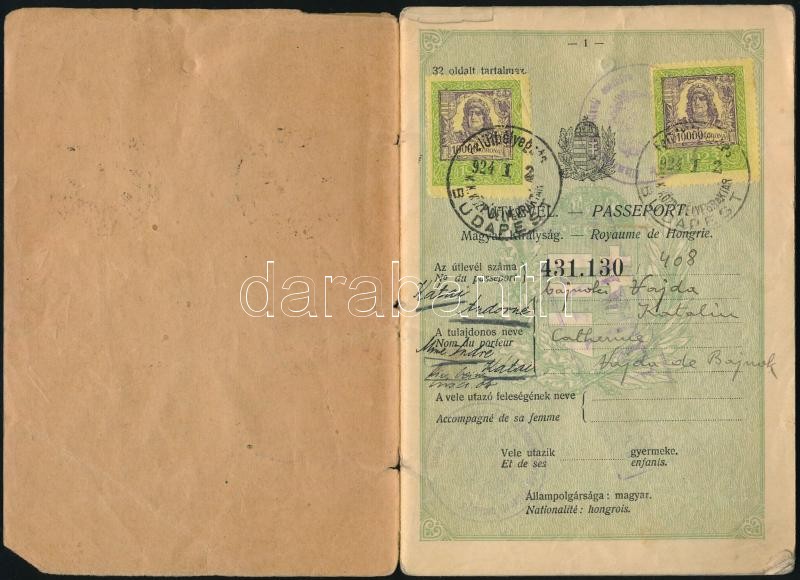 1924-1930 Magyar Királyság fényképes útlevele Kátai Andorné bajmoki Vadja Katalin, bajmoki Vajda Imre pesti zsidó származású bankár, korábban a Magyar Kereskedelmi Rt. igazgatója, lánya részére szóló útlevél, 6 db 1000 K. és 4 db 80 F. és külföldi okmánybélyeggel, osztrák, francia, svájci, olasz, jugoszláv, csehszlovák bejegyzésekkel, pecsétekkel, meghosszabbításokkal.