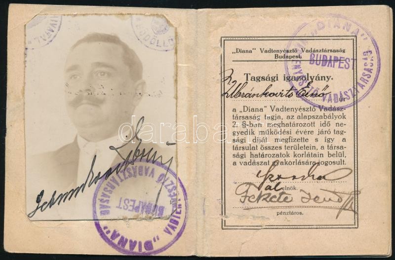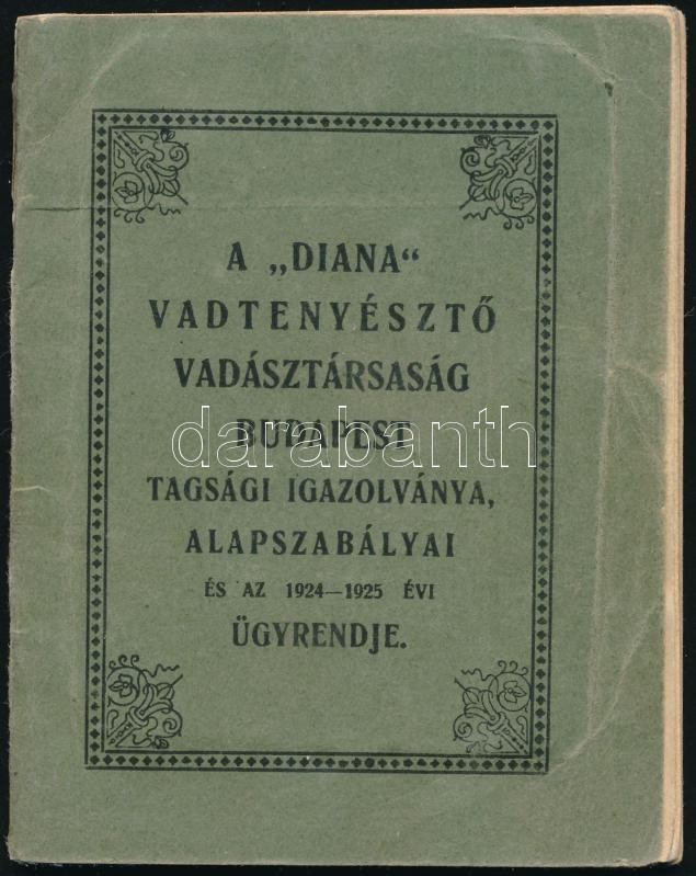 1924 A Diana vadtenyésztő vadásztársaság tagsági igazolványa, alapszab... https://www.darabanth.com/de/361-Fernauktion/361.0/Kunst-Dokumente-andere-Sammelgebiete/Dokument~500020/1924-A-Diana-vadtenyeszto-vadasztarsasag-tagsagi-igazolvanya-alapszabalyai-es-ugyrendje-~II2085184