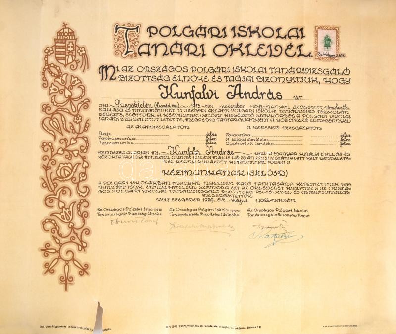 1939 Szeged, polgári iskolai tanári oklevél, kézimunka tanítására, aláírásokkal, 1 P okmánybélyeggel, feltekerve, a feltekerés mentén törésnyomokkal, a szélén szakadással, 47x56 cm