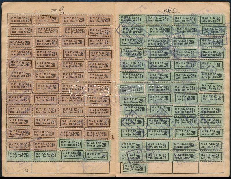 Beschreibung: cca 1939 a Magyarországi Vas- és Fémmunkások Központi Szövetsége temetkezési segélyalap tagsági igazolványa 398 db tagsági bélyeggel
