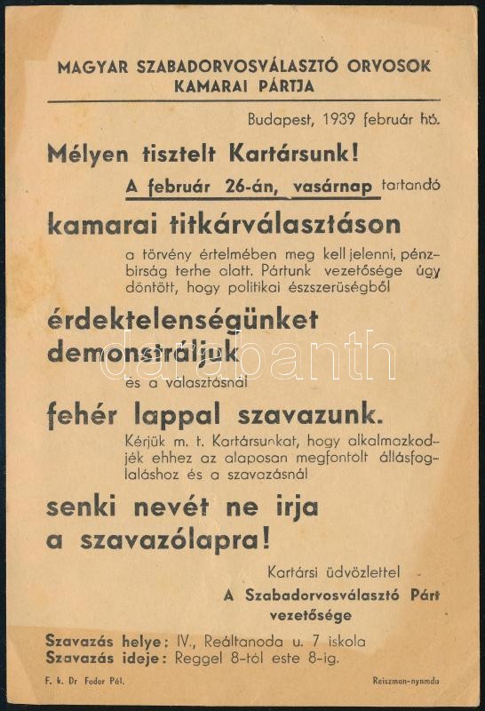 Beschreibung: 1939 Bp., "Érdektelenségünket demonstráljuk" - Magyar Szabadorvosválasztó Orvosok Kamarai Pártjának szórólapja