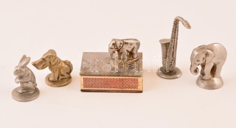 Cigaretta eloltására használt fém hamutartó figura (elefánt, kutya, nyúl, szaxofon), és egy elefánt figurás fém gyufásdoboz-borító, 5 db, 6 cm és 3,5 cm közötti méretben, gyufásdoboz-borító: 5x4x1,5 cm, m: figurával együtt: 4,5 cm