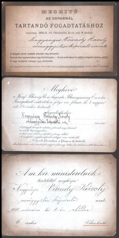 cca 1890-1905 Váradi Várady Károly (1859-1914) ügyvéd, országgyűlési képviselő részére küldött névre szóló meghívók a legfelsőbb körök rendezvényeire, báljára. Királyi meghívó, udvari bál, grófok, főrendek. összesen 22 db nagyobb méretű meghívó