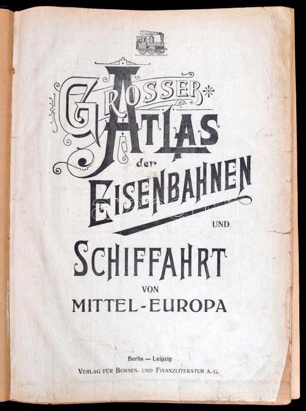 1921 Grosser Atlas der Eisenbahnen und Schiffahrt von Mittel-Europa. Deutsches Reich.+Verzeichnis von Verkehrs-Orten (Nicht-Eisenbahn-Stationen) des Deutschen Reiches mit Kilometer-Angabe der Nächstegelegenen Post- und Eisenbahn-Station zum...+Anhang zum...Internationaler Anzeiger für Spedition, Schiffahrt und Industrie.+Separat-Anhang zum ... Berzugsquellen-Register und Allgemeines Spediteur-Verzeichnis. Berlin-Leipzig, 1921, Verlag für Börsen- und Finanzliteratur A.-G., 6+XIV p.+1 t.+2+294 p.+68 t.+133+2+110+LV p. XXIII. kiadás. Német nyelven. Korabeli reklámokkal. Korabeli félvászon-kötésben, kopott borítóval, sérült gerinccel.