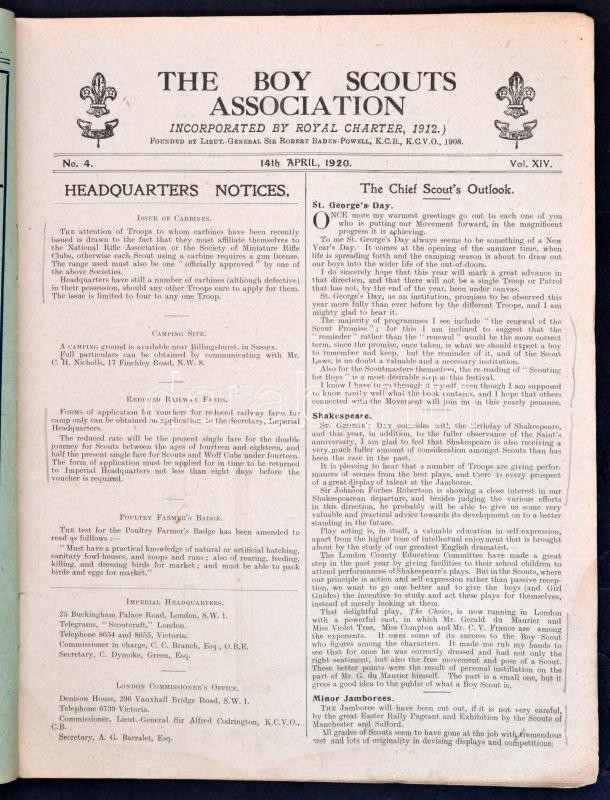 1920 The Boy Scouts Association Headquarters Gazette. 14. teljes évfol... https://www.darabanth.com/de/361-Fernauktion/361.0/Kunst-Dokumente-andere-Sammelgebiete/Pfadfinder~500028/1920-The-Boy-Scouts-Association-Headquarters-Gazette-14-teljes-evfolyam-Angol-nyelven-Valtozo~II2080789