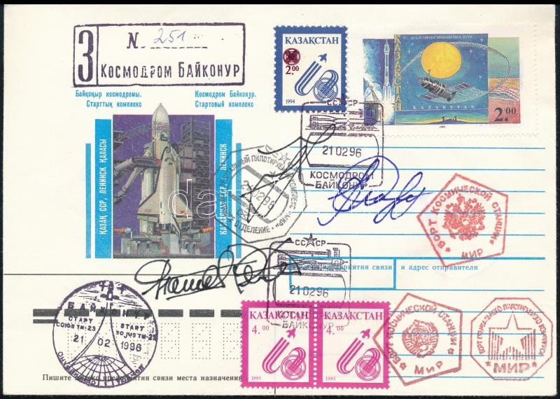 1996 Szojuz Tm-22 Szergej Avgyejev (1956- ), Jurij Gidzenko (1962- ) orosz és Thomas Reiter (1958- ) német űrhajósok aláírásai emlékborítékon MIR űrállomás pecsétjével / Signatures of Sergei Avdeyev (1956- ), Yuriy Gidzenko (1962- ) Russian and Thomas Reiter (1958- ) German astronauts on envelope