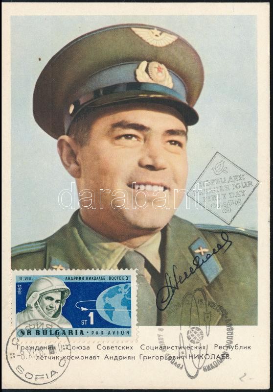 Andrijan Nyikolajev (1929-2004) szovjet űrhajós aláírása őt magát ábrázoló képeslapon / Signature of Andrijan Nyikolajev (1929-2004) Soviet cosmonaut on postcard