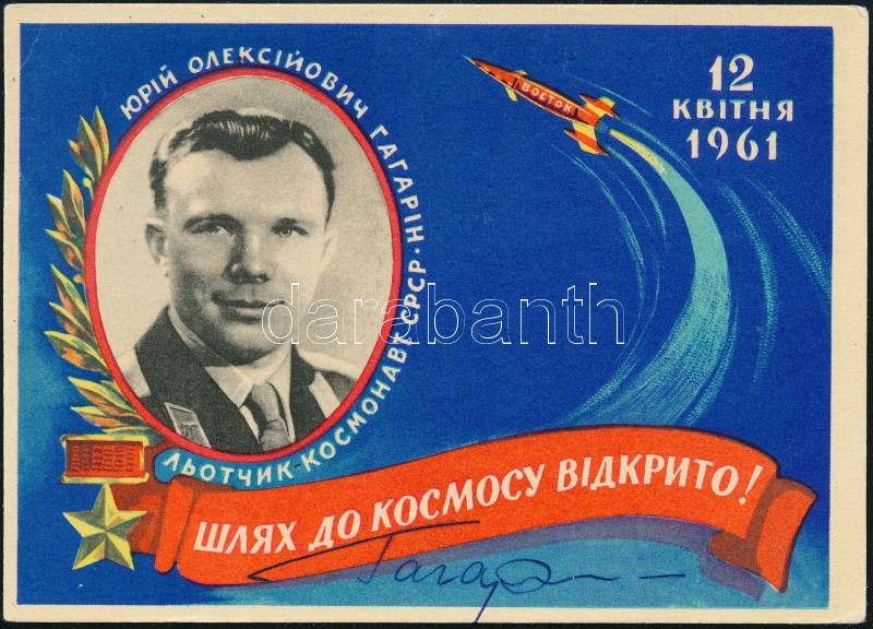 Jurij Alekszejevics Gagarin (1934-1968) szovjet űrhajós autográf aláírása futott képeslapon of Yuriy Alekseyevich Gagarin (1934-1968) Soviet astronaut on postcard with special cancellation
