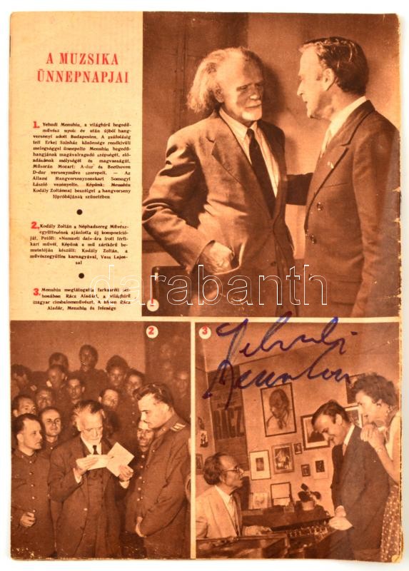 Beschreibung: Yehudi Menuin karmester saját kezű aláírása őt ábrázoló újságkivágáson