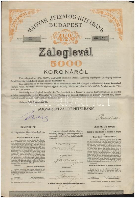 Beschreibung: 1909-1910. "Magyar Jelzálog Hitelbank" 4 1/2%-os záloglevele 5000K-ról, szelvényekkel, szárazpecséttel (2x) T:III