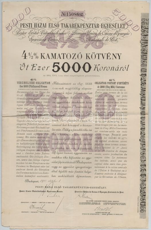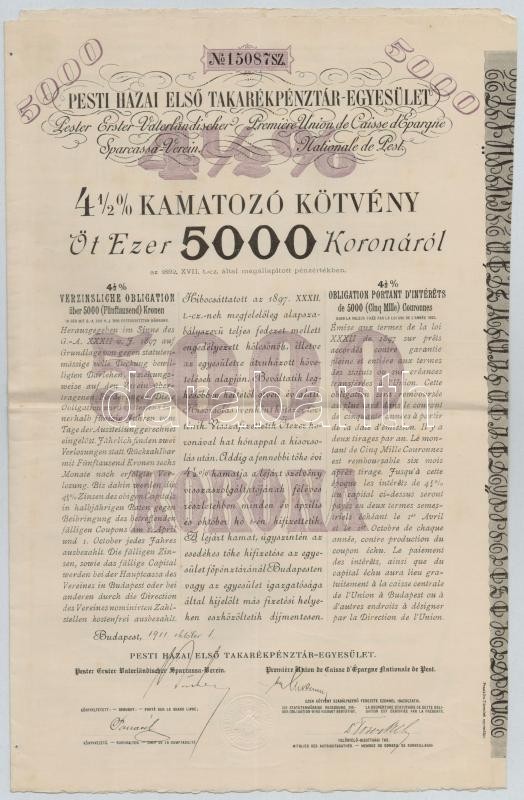 1911. "Pesti Hazai Első Takarékpénztár-Egyesület" 4 1/2%-os ... https://www.darabanth.com/de/361-Fernauktion/361.0/Numismatik/Aktien-und-Tickets~2000005/1911-Pesti-Hazai-Elso-Takarekpenztar-Egyesulet-4-12-os-zaloglevele-5000K-rol-2x-sorszC3~II1980876
