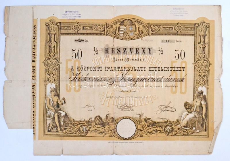 Beschreibung: Budapest 1876. "A Központi Ipartársulati Hitelintézet" 1/2 részvénye 50Ft-ról szelvényekkel, bélyegzésekkel és szárazpecséttel T:III-