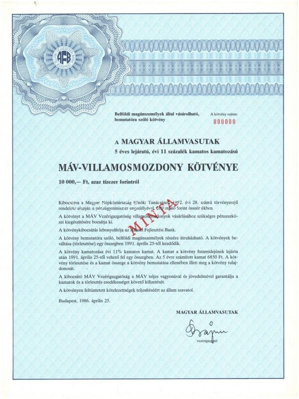 Budapest 1986. "A Magyar Államvasutak 5 éves lejáratú, évi 11 százalék kamatos kamatozású MÁV-Villamosmozdony kötvénye" 10.000Ft-ról, "000000"-ás sorszámmal, "MINTA" felülnyomással T:I-
