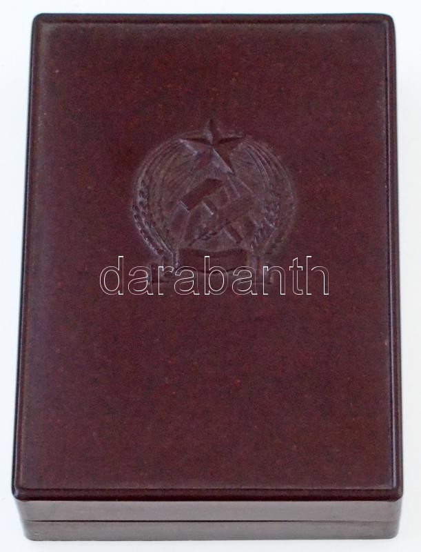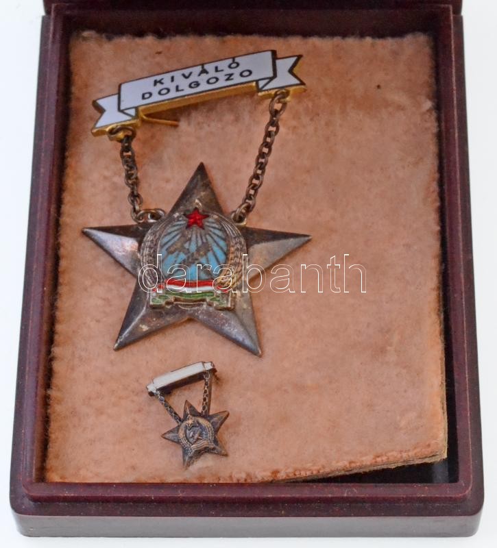 Beschreibung: ~1950. "Kiváló dolgozó" Rákosi-címeres zománcozott fém kitüntetés dísztokban, miniatűrrel T:2