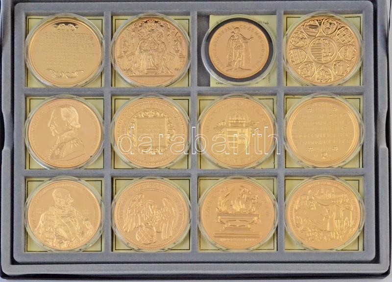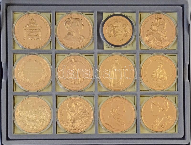 DN "Magyar Aranyóriások" aranyozott Cu utánveret sorozat 12db klf érme tanúsítvánnyal, 24 férőhelyes éremtartó kazettában, kivehető tálcával T:PP