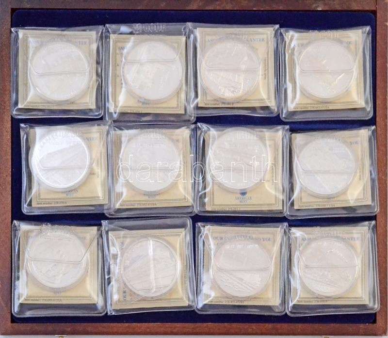 DN "The HIstory of Railroads (A vasút története)" jelzett Ag, ismert mozdonyokat ábrázoló emlékérem sorozat (12xklf), 12 férőhelyes fa dísztokban, tanúsítványokkal (érmenként 20g/0.999/40mm) T:PP