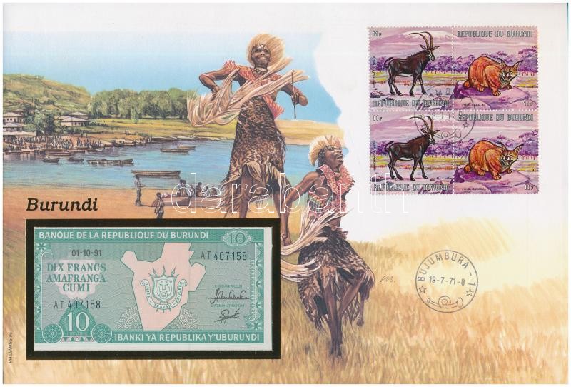 Burundi... https://www.darabanth.com/de/361-Fernauktion/361.0/Numismatik/Umschlage-mit-Munzen-und-Banknoten~2000004/Burundi-1991-10Fr-felbelyegzett-boritekban-belyegzessel-T1-Burundi-1991-10-Francs-in-envel~II2076758
