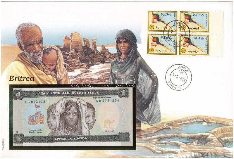 Eritrea ... https://www.darabanth.com/de/361-Fernauktion/361.0/Numismatik/Umschlage-mit-Munzen-und-Banknoten~2000004/Eritrea-1997-1N-felbelyegzett-boritekban-belyegzessel-TI--Eritrea-1997-1-Nakfa-in-envelope~II2075339
