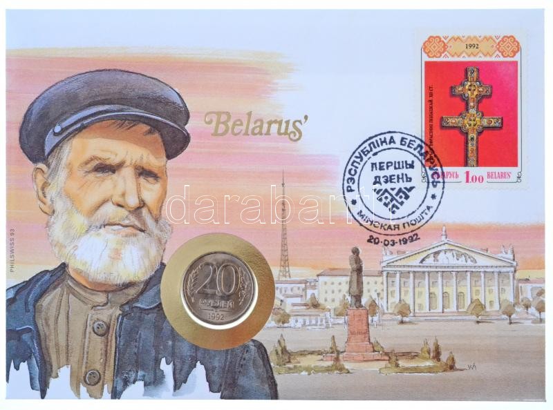 Fehéroroszország felbélyegzett borítékban, bélyegzéssel benne Oroszország 1992. 20R, német nyelvű leírással T:I Belarus in envelope with stamp and cancellation, in it Russia 1992. 20 Roubles, with German language description C:UNC